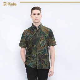 Elira - Kemeja Batik Pria Lengan Pendek Regular Fit Bordir Smock Katun Hijau